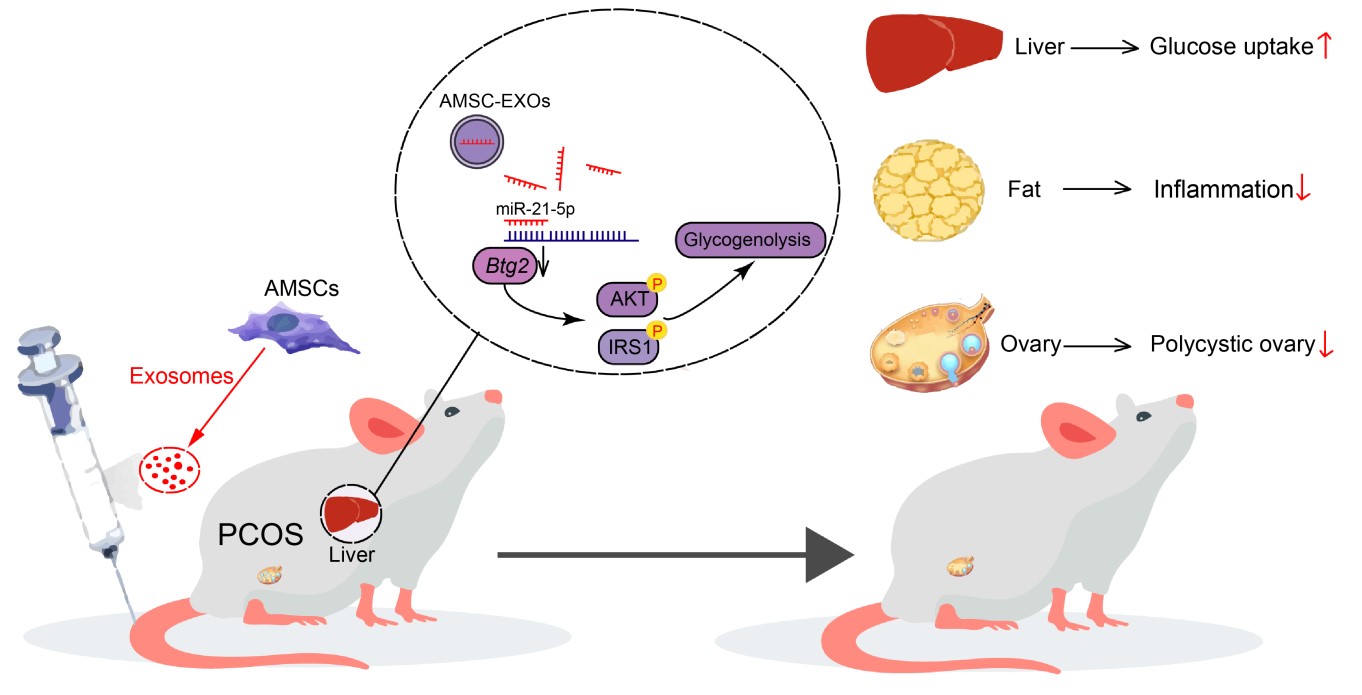近年来,周虚教授课题组围绕PCOS治疗和发病机制展开了深入系统的研究。在本研究中,利用大鼠模型,首次从脂肪间充质干细胞(Adipose-derived mesenchymal stem cellsAMSCs)角度观察其对PCOS的治疗效果,并深入解析了作用分子机制。研究发现,AMSCs能显著改善PCOS症状,其作用机制是AMSC通过释放携带miR-21-5p的外泌体靶向Btg2基因,激活了p-IRS1p-AKT通路,促进肝细胞对葡萄糖的摄取能力,最终达到治疗PCOS的效果。研究结果为干细胞用于临床治疗PCOS提供了新思路,也为研究动物卵泡囊肿的防治奠定了理论基础。