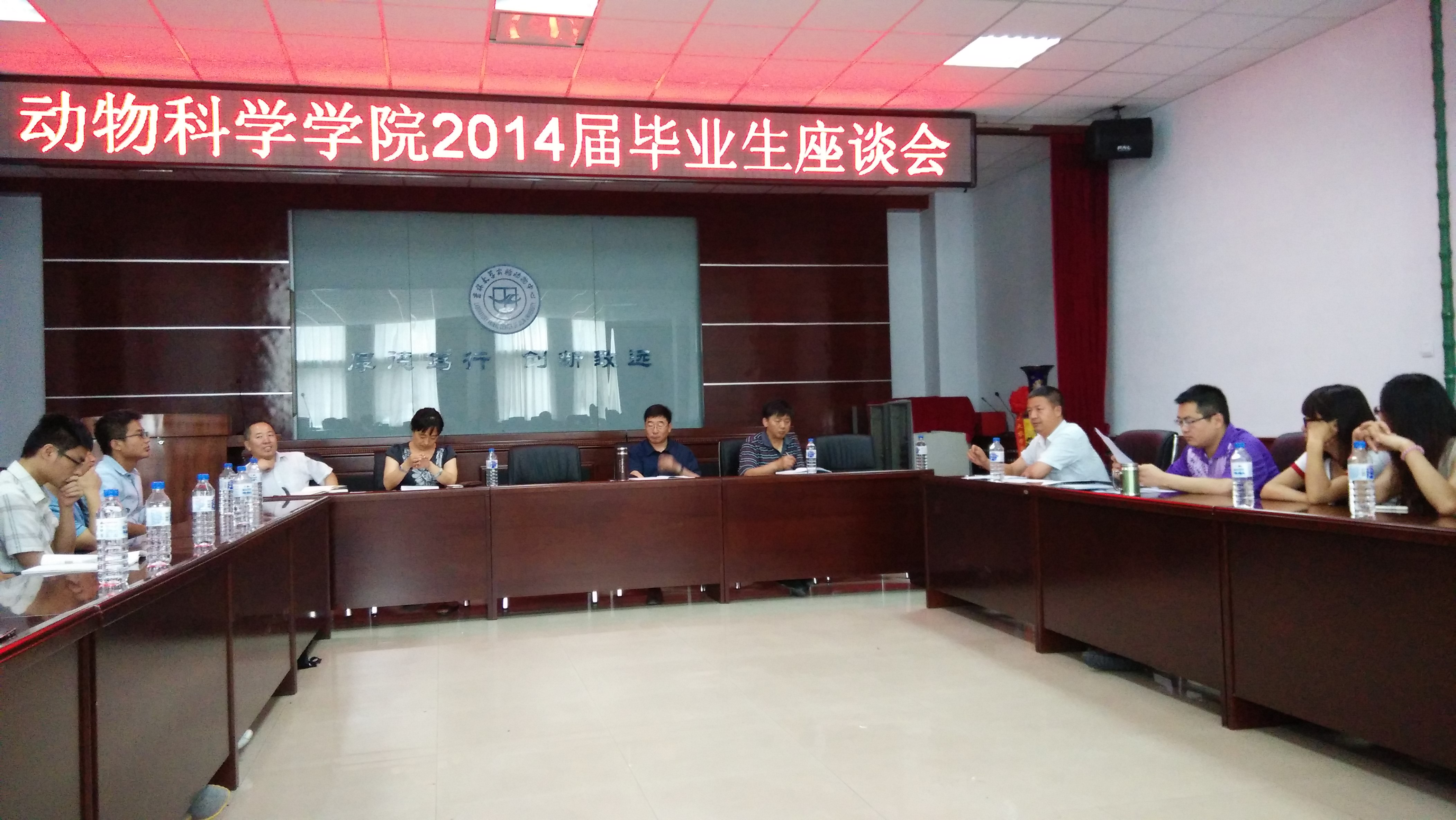 2014年6月23日下午2:00,2014届毕业生座谈会在公司一楼会议室举行,此次座谈会以“心系动科,共谋学经理足发展”为主题,由公司党委副书记曹伟光主持,经理张嘉保教授,副经理任文陟教授,副经理于景海老师,生物技术系主任逄大欣教授,动物科学系主任沈景林教授,实验动物系党支部书记袁宝老师,各办公室主任、毕业班辅导员及14名优秀毕业生代表均到场参加。