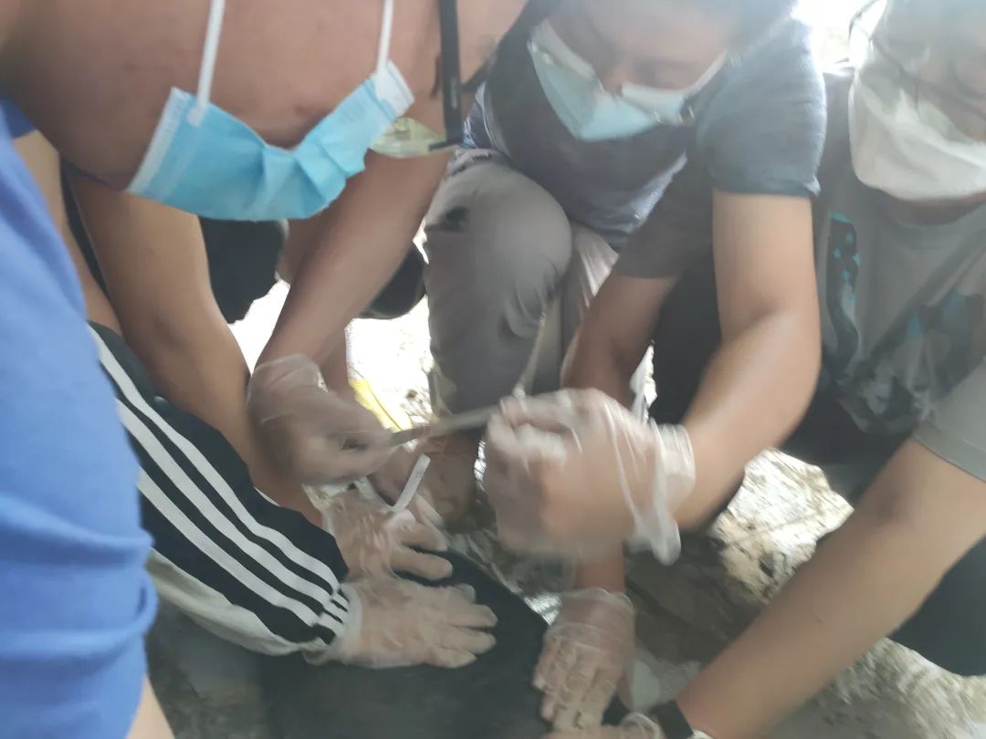 7月13日早上,团队一行人先后来到通榆县社会福利服务中心、花芊谷集团和八面乡草原三个地点,在专业老师的带领和示范下,分为测量组和免疫组,先后对300余只鹅雏开展免疫疫苗注射和体重体尺测量工作。