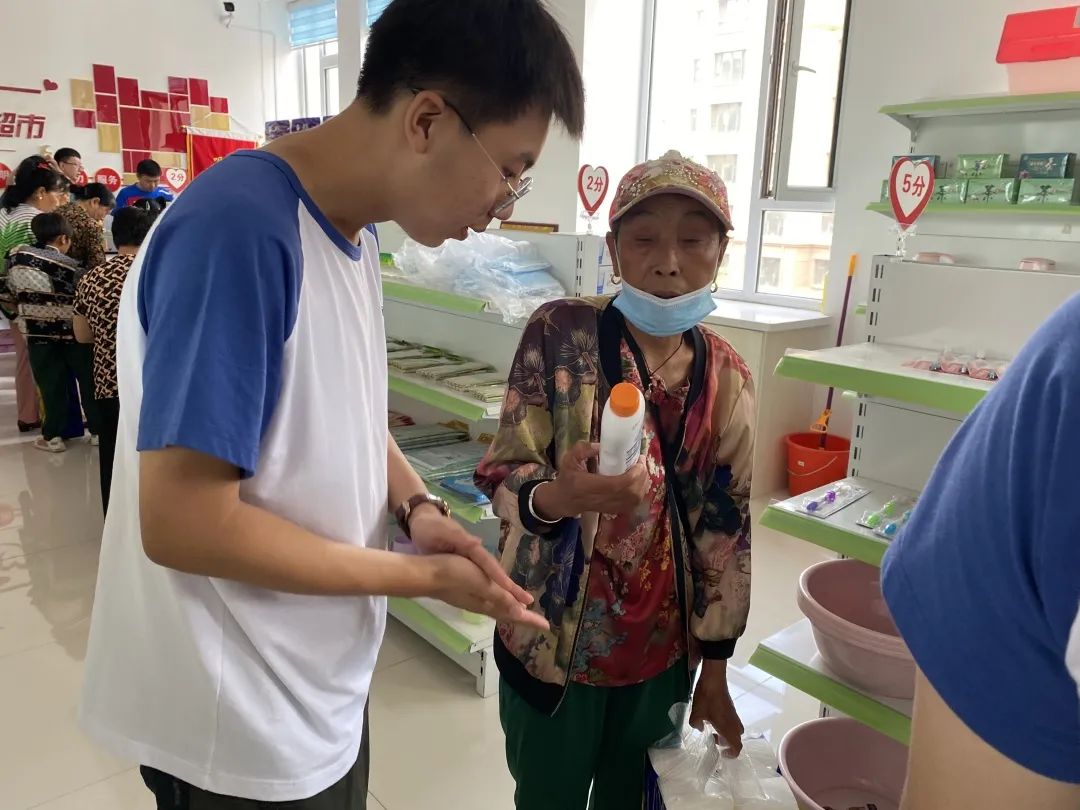 当天是星期三,正值铁西镇一周一次的“爱心超市”分值兑换活动,征得村委会同意,团队成员在超市中帮助村民们挑选商品、与村民沟通交流,亲身参与到超市的运营之中。在这一过程中,同学们了解到“爱心超市”是当地政府创设的以“诚信积分”换取生活用品的互助模式,也叫“信易超市”。村民们通过参与村里公益活动、卫生清洁以及“四道评比”等活动获得“诚信积分”,用积分到超市可以换取生活必需品。这种模式一方面可以培养当地贫困户的劳动意识,通过劳动积分换取商品,另一方面,尽可能降低贫困户生活成本,在生活上尽量帮助他们。