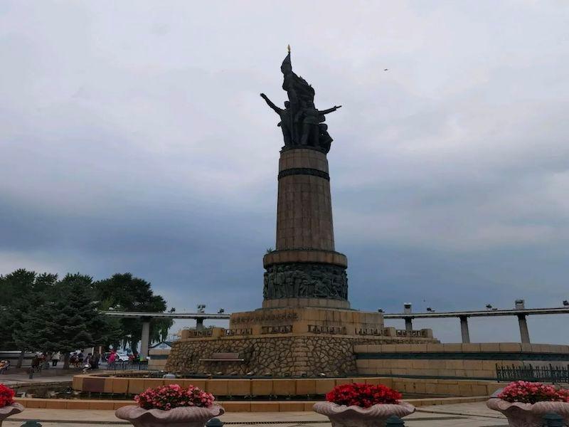 满洲里苏联红军烈士公园内包含红军烈士纪念塔和烈士公墓,纪念塔塔身雕刻着“光荣永远属于为苏联荣誉与胜利而牺牲的英雄们”,镶嵌着苏联红军浮雕。在庄严肃穆的气氛中,团队成员瞻仰烈士纪念碑,感悟初心使命,缅怀革命先烈。