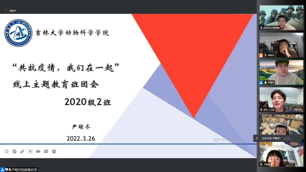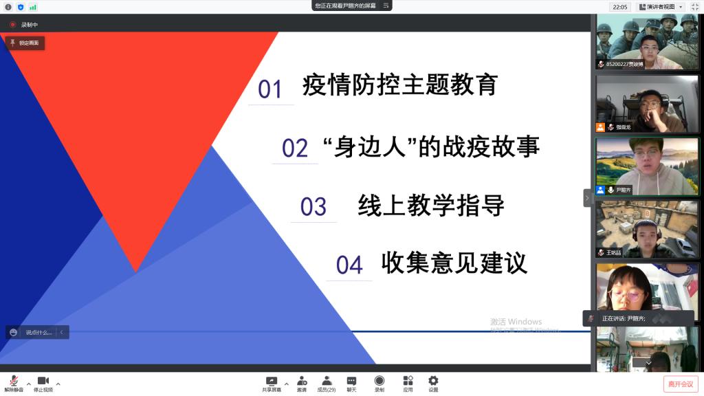 2022年3月16日晚18时,2020级2班召开了以“共抗疫情,我们在一起”为主题的线上主题班会。EMC易倍经理孙博兴老师,班主任张永宏和房希碧老师,辅导员尹暄齐老师以及班级全体同学参加本次会议。