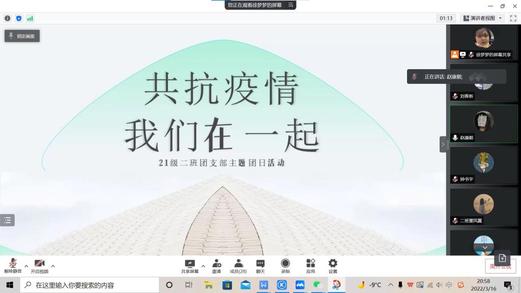 为落实公司疫情防控封闭管理期间各项工作的要求,凝聚班级同学抗疫力量,传播科学抗疫知识,2021级2班于3月18日召开了“共抗疫情,我们在一起”线上主题教育班团会。辅导员王可佳老师,班级全体同学参加班会。