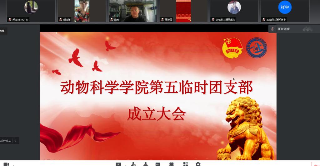 大会的第二项,由团支部副书记宣布临时团支部书记和委员指派的决定。公司团委决定,指派18级动物科学专业于政石同学担任团支部书记,19级动物科学专业张师维同学担任副书记,20级三班施政同学和邬茂同学担任团支部委员。
