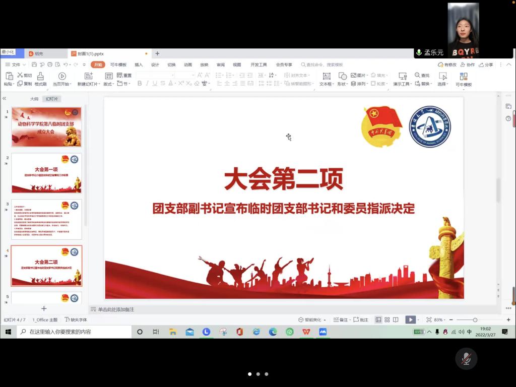 会议第二项,由团支部副书记宣布第八临时团支部书记和委员指派的决定:团支部书记为2019级吴诺同学、团支部副书记为2020级孟乐元同学、团支部宣传委员为2019级梁玉茹同学、团支部组织委员为2020级赵春秀同学。