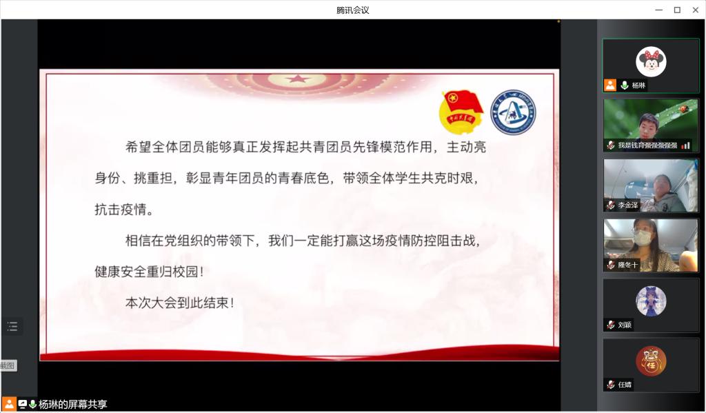 最后,团支部书记杨琳进行会议总结:“希望全体团员能够真正发挥起共青团员先锋模范作用,主动亮身份、挑重担,彰显青年团员的青春底色,带领全体员工共克时艰,抗击疫情,相信在党组织的带领下,我们一定能打赢这场疫情防控阻击战,健康安全重归校园!”。