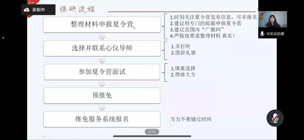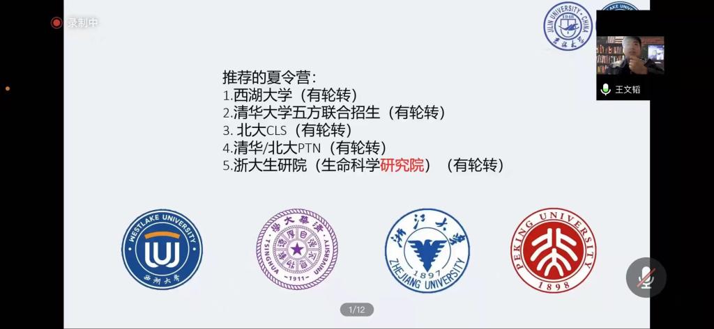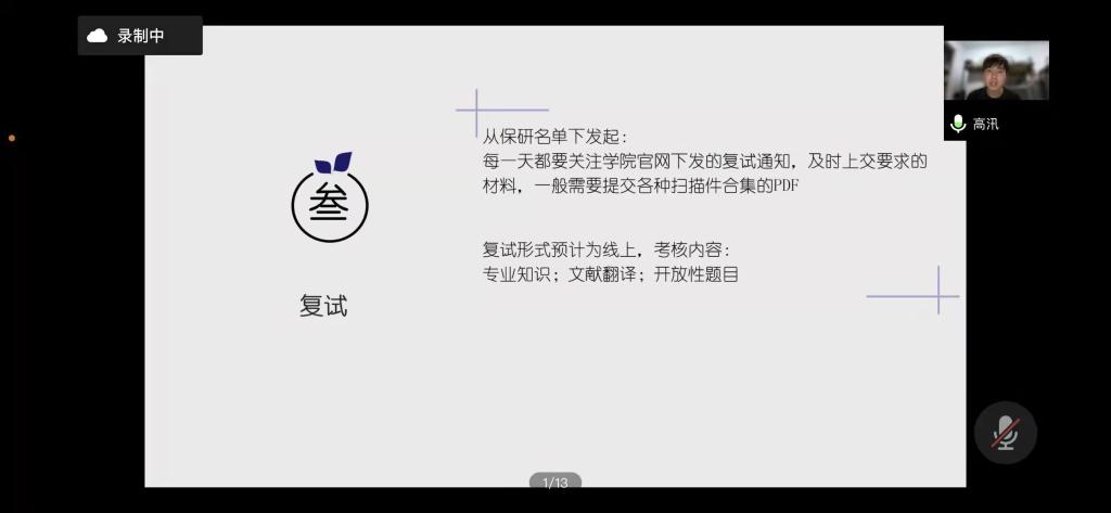 在主持人进行简单介绍后,七位同学依次开始向同学们分享自己的保研经验。保研到北京协和医公司的刘鑫苗同学以时间轴作为框架,向同学们具体讲述了相应保研时间节点应该进行的材料准备、夏令营申报、联系导师等保研步骤的具体流程以及相关注意事项。保研到西湖大学的王文韬同学建议大家要扎实专业知识,清楚并熟悉科研经历中所有可能涉及到的专业知识点。进行有针对性的准备。保研到中科院巴斯德研究所的田娜同学则提醒大家要注意保研信息的搜集,她强调:保研是一场信息战,即将保研的同学们要在公司官网搜集目标公司专业的招生情况、夏令营情况以及导师研究方向等信息。保研到浙江大学的徐玲瑶同学则是以自身经历为基础详细讲述了面试时可能遇到的问题及应对办法,她着重强调面试时态度要好,做到见招拆招,灵活变通。2018级的高汛同学作为保研本校的代表细致地分析了EMC易倍官方网站的保研条件、面试笔试考核的难度与复习重点。他指出在备战保研时不应将时间放在无意义的纠结与自我怀疑中,而应将有限的时间利益最大化,做到有的放矢。最后,2017级陈俊波、何松同学向同学们强调,研究生阶段的学习生活,不仅要有过硬的学术本领,更要有良好的人际关系和沟通能力,为自己的学术道路打好坚实的基础。