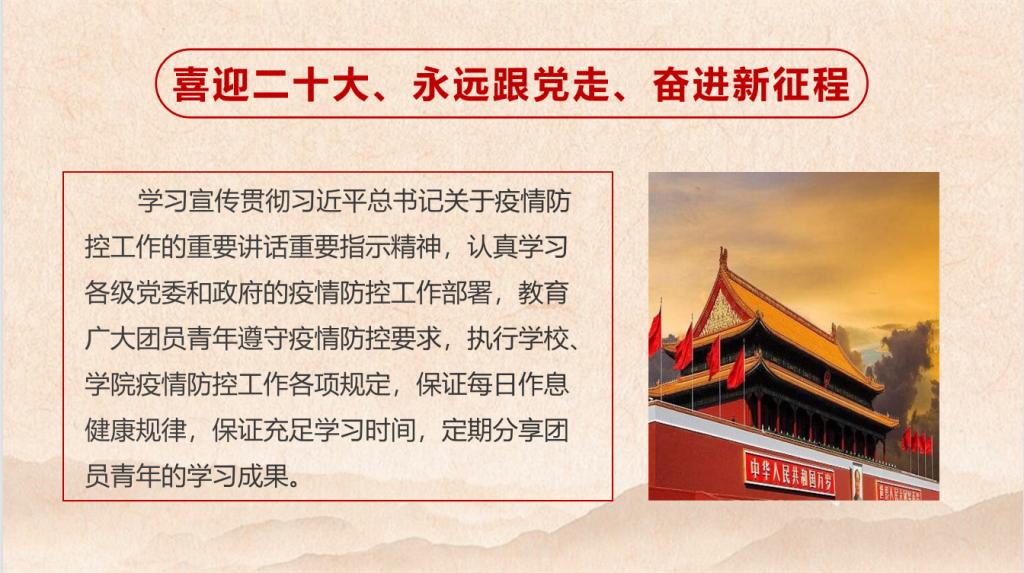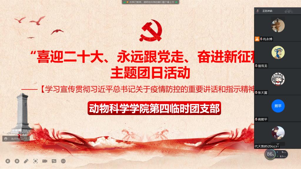 为进一步落实学习宣传贯彻习近平总书记关于疫情防控工作的重要讲话重要指示精神,认真学习各级党委和政府的疫情防控工作部署,教育广大团员青年遵守疫情防控要求,执行公司、公司疫情防控工作各项规定,EMC易倍第四临时团支部于2022年4月3日下午19时,依托腾讯会议开展“喜迎二十大、永远跟党走、奋进新征程”主题团日活动。EMC易倍第四临时团支部全体同学积极参与。活动由团支书巩永博主持。