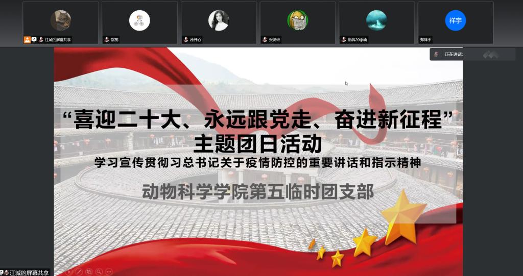 为学习宣传贯彻习近平总书记关于疫情防控工作的重要讲话指示精神,认真学习各级党委和政府的疫情防控工作部署,教育广大团员青年遵守疫情防控要求,执行公司、公司疫情防控工作各项规定,公司应校团委要求,指示EMC易倍各临时团支部举办相关主题团日活动。2022年4月3日下午14时,EMC易倍第五临时团支部举办“喜迎二十大、永远跟党走、奋进新征程”主题团日活动。主题团日活动由团支部书记于政石同学主持,第五临时团支部支委会成员以及EMC易倍18级动物科学专业、19级动物科学专业、20级三班全体男生参加活动。