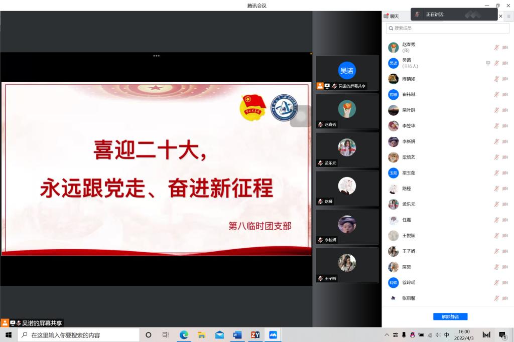 今年是中国共产主义青年团成立一百周年,是党的二十大召开之年,也正是抗疫防控的关键时刻。为贯彻落实“两会”精神,迎接二十大召开,引领广大团员青年坚定跟党走、成才报国信念,教育广大团员青年遵守疫情防控要求,2022年4月3日,EMC易倍第八临时团支部开展“喜迎二十大、永远跟党走、奋进新征程”主题团日活动,EMC易倍第八临时团支部全体同学积极参与本次活动。活动由团支书吴诺主持。
