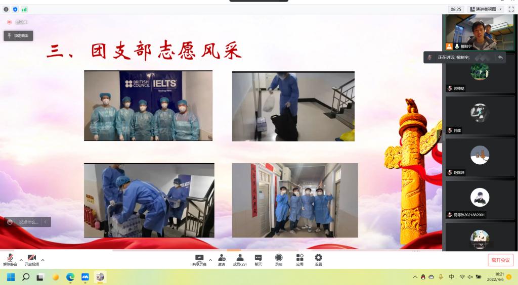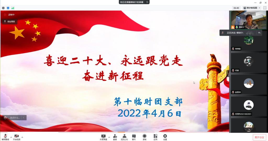 为学习贯彻习近平总书记关于疫情防控工作的重要指示精神、认真学习各级党委和政府的疫情防控工作部署,教育广大团员青年遵守疫情防控要求,执行公司、公司疫情防控工作各项规定,保证每日作息健康规律,保证充足学习时间。EMC易倍第十临时团支部于4月6日晚6时召开“喜迎二十大,永远跟党走,奋进新征程”为主题的团日活动。此次会议采取线上腾讯会议的形式举行,第十临时团支部全体团员参与了此次活动。会议由团支部副书记任中帅主持。
