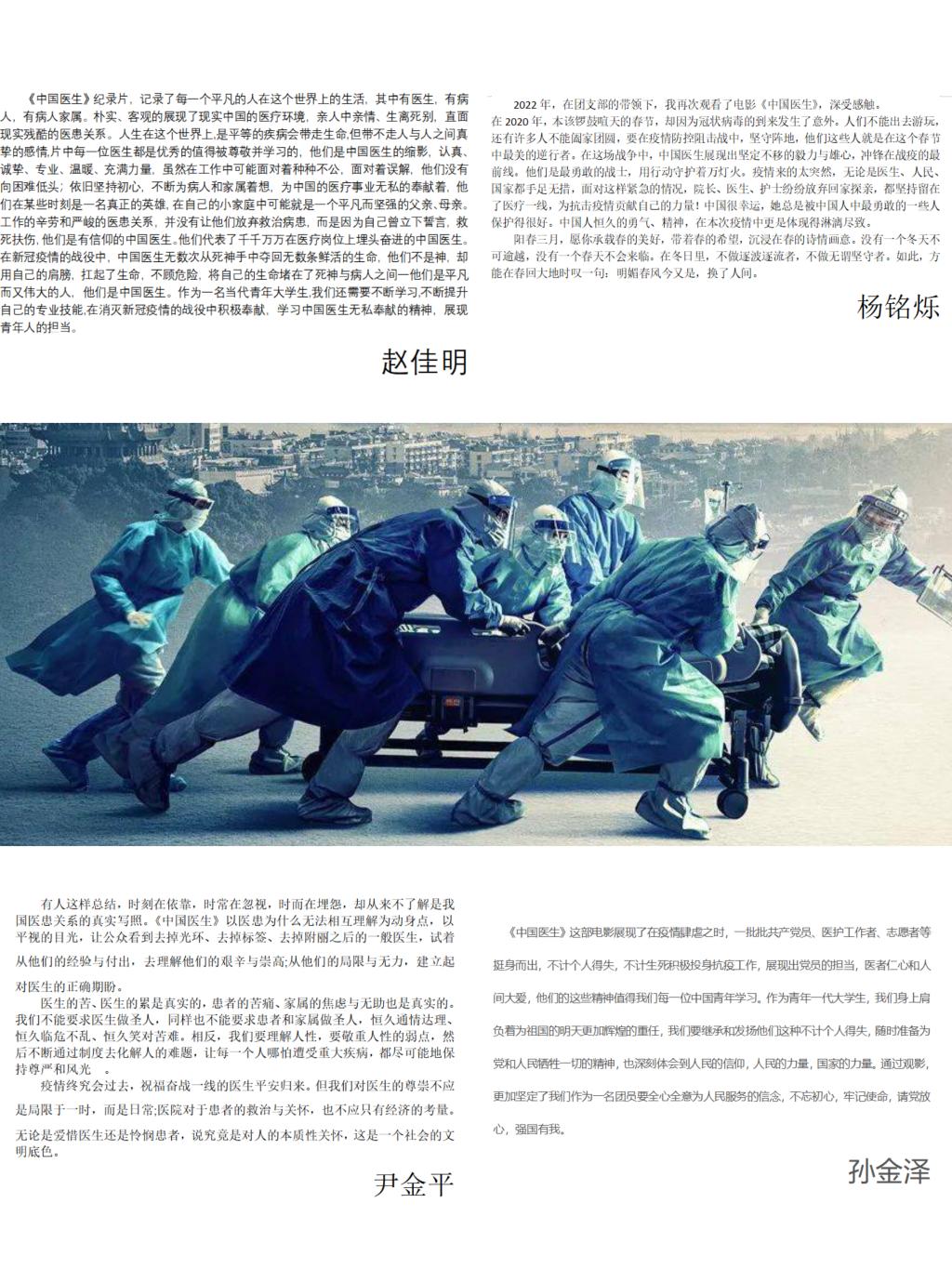 于贤材同学接着说到,“晚上和大家一起观看了《中国医生》这部电影,一下子把时间带回了两年前。那个非同寻常的春节。这部电影没有酷炫的特效,没有所谓的剧情。有的,只是真实,疫情现场的真实情况,医护人员和武汉及全国人民的真情实感。拖着重病奋战在抗议一线的张定宇经理,他那一句“所有责任,我来承担”,是多么的铿锵有力,“我救得了众人,却唯独救不了你”,让我看到了医生想拼尽全力救治病人却无能为力的无奈与痛苦。孩子刚出生自己却感染新冠的外卖小哥坐地嚎啕的绝望。时代需要英雄,时代也产生英雄。《中国医生》顺应时代,见证时代,书写时代及时代里的平民英雄。疫情没有硝烟,危险却堪比硝烟,没有医护人员、广大干部、志愿者和老百姓,这仗我们不会这么快结束。空荡荡的街道,让我看到了中国人民的集体主义精神和利他精神。我觉得这部电影出众的也许并不是他的拍摄技巧,而是电影的事件背景是我们每个人共同经历过的一段艰难时光,让我们产生了强烈的情感共鸣。没有什么岁月静好,只不过有人替我们负重前行罢了,当下的和平是先辈们用鲜血换来的!疫情的成功遏制是”逆行者”们用汗水和泪水换来的!”