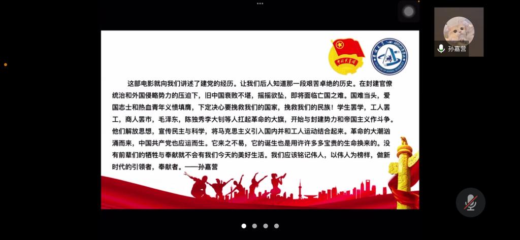 王婉凝同学表示,“此次观影,我从伟大建党精神中汲取精神营养,也让我想到建党90年后的今天,同样有许多党员如老一辈党员一样,为国家奋不顾身,坚守在抗“疫”最前线,而我作为新时代团员也应为疫情的控制贡献自己的一份小小力量。”