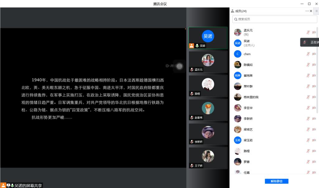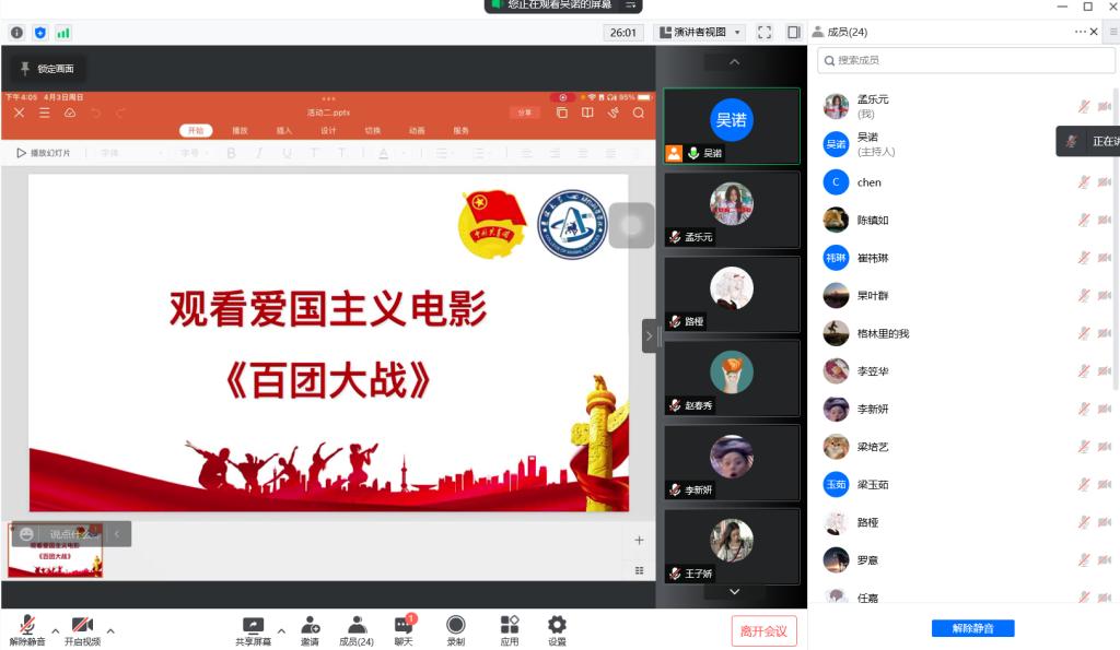 活动第一项,由团支书吴诺介绍爱国主义电影百团大战的背景和历史意义。百团大战再现了抗日战争时期八路军在华北敌后发动的一次大规模进攻和反“扫荡”的战役。1939年冬以来,日军推行“以铁路为柱,公路为链,碉堡为锁”的“囚笼政策”,并实行“杀光,抢光,烧光”的策略,意图困住并彻底除掉共产党党员和百姓。与此同时,国民党在华北挑起第一次反共高潮,向山西新军和八路军发动大规模军事进攻,使日军“囚笼政策”得以趁机推行,给抗日根据地造成严重困难。国民党内一些人更加动摇,妥协投降危机空前严重。在这种情况下,1940年春,彭德怀、左权等人和到太行山八路军总部的聂荣臻讨论确定破袭正太铁路。包括第120师、第129师、晋察冀军区在内的105个团成功摧毁正太路交通,破坏日军的交通线,并摧毁日军深入抗日根据地的主要据点,反击日军的报复性“扫荡”,赢得了胜利。