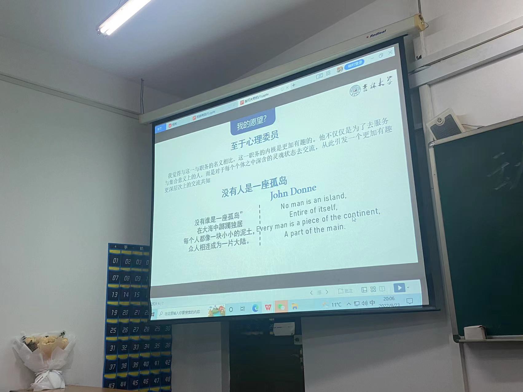 班团干部竞聘结束后,各班开展第一次线下班会。第一次线下班会相较于此前的线上班会,让同学们更有参与感和归属感。大家都热情洋溢,逐个上台向大家介绍自己,同学们各有所长、兴趣广泛,人没有一丝怯场,将班会气氛推向顶峰。