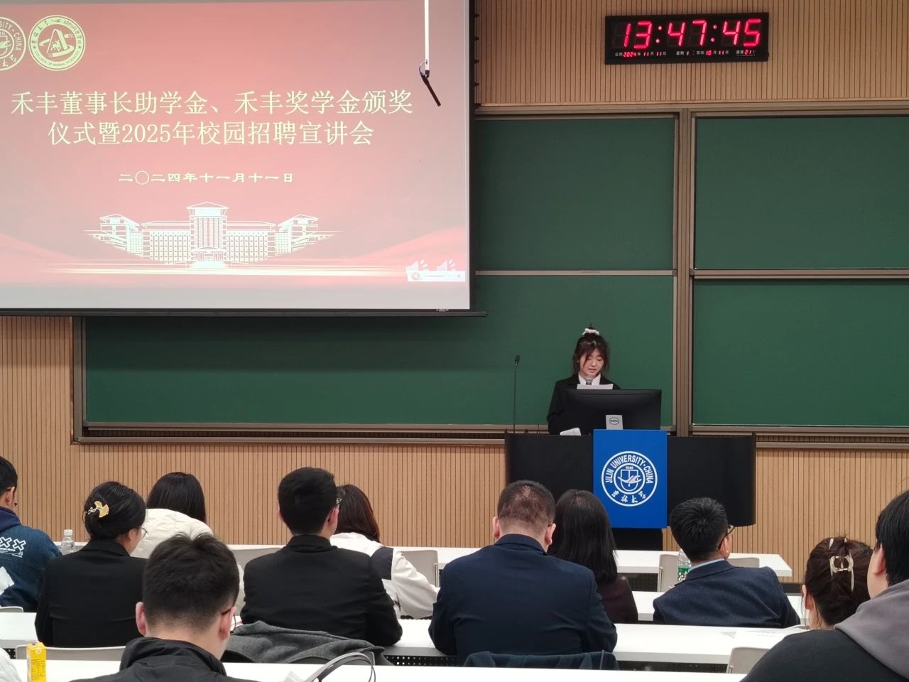 情系高校学子,聚焦农科人才,成就青年梦想。为表彰优秀农科学子,搭建校企合作交流平台,11月11日下午,2024年度“禾丰董事长助学金”“禾苗奖学金”颁奖仪式暨校园宣讲会在和平校区科学讲堂100教室顺利举办。禾丰股份沈禾猪料事业线销售总经理刁秀镯、辽宁区招聘培训COE杜娟、猪料事业线后方HR经理刘旭、公司党委副书记肖建荣、动物医学公司党委副书记谭瑶以及两公司辅导员参加会议。