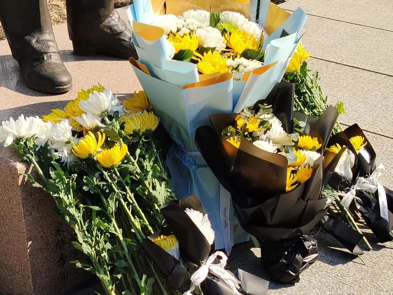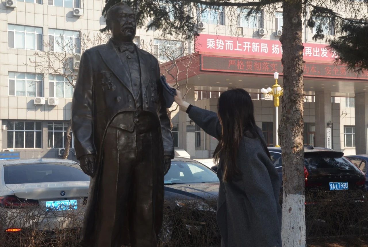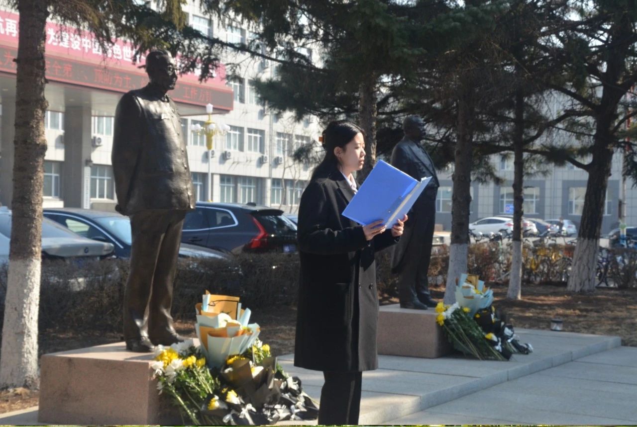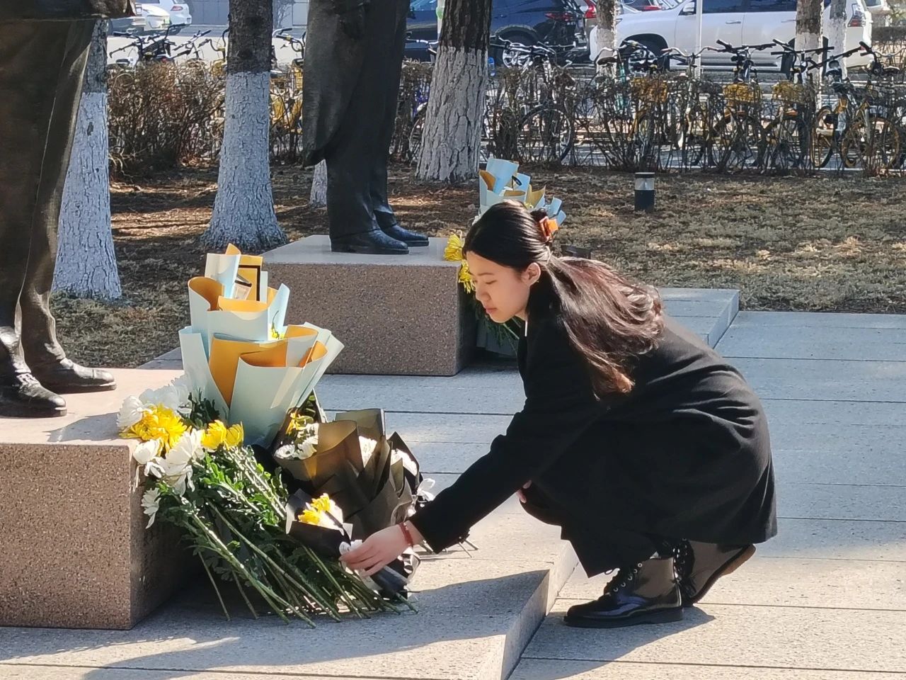 讲述结束后,员工代表缓步上前,仔细擦拭三位先贤的铜像。随后,贾子一老师带领全体成员列队肃立,依次敬献白菊并默哀一分钟。春风拂过,白菊轻颤,铜像熠熠生辉,无声的仪式中凝聚着对先贤的无限敬仰。