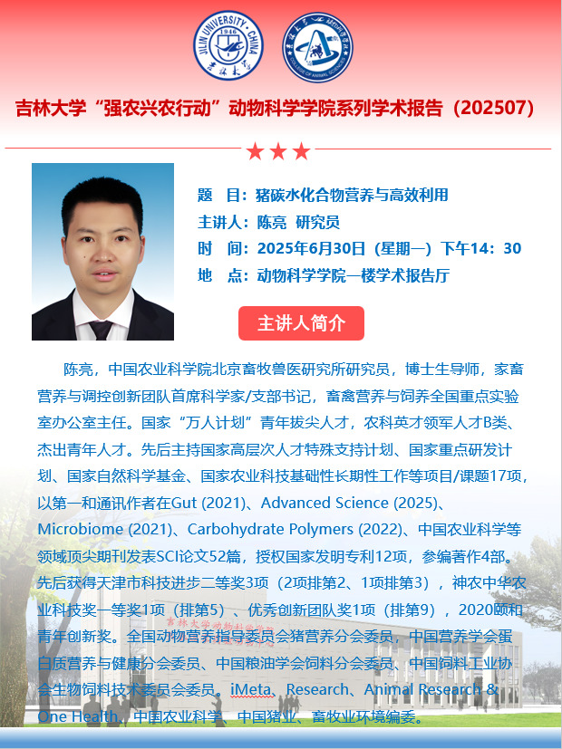陈亮,中国农业科公司北京畜牧兽医研究所研究员,博士生导师,家畜营养与调控创新团队首席科学家/支部书记,畜禽营养与饲养全国重点实验室办公室主任。国家万人计划青年拔尖人才,农科英才领军人才B类、杰出青年人才。先后主持国家高层次人才特殊支持计划、国家重点研发计划、国家自然科学基金、国家农业科技基础性长期性工作等项目/课题17项,以第一和通讯作者在Gut (2021)Advanced Science (2025)Microbiome (2021)Carbohydrate Polymers (2022)、中国农业科学等领域顶尖期刊发表SCI论文52篇,授权国家发明专利12项,参编著作4部。先后获得天津市科技进步二等奖3项(2项排第21项排第3),神农中华农业科技奖一等奖1项(排第5)、优秀创新团队奖1项(排第9),2020颐和青年创新奖。全国动物营养指导委员会猪营养分会委员,中国营养学会蛋白质营养与健康分会委员、中国粮油学会饲料分会委员、中国饲料工业协会生物饲料技术委员会委员。iMetaResearchAnimal Research & One Health、中国农业科学、中国猪业、畜牧业环境编委。