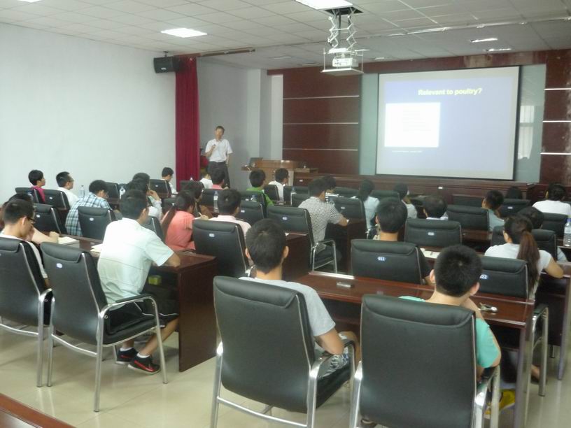 7月11日,美国加州大学戴维斯分校(UC DAVIS)动物科学系周怀军副教授在中国农业大学王军军副教授、山东农业大学李显耀副教授等的陪同下应邀到EMC易倍开展学术交流,并为公司师生做了题为“Genetic architecture of resistance to pathogens in the chicken using a systems biology approach”的学术报告。公司经理张嘉保教授、副经理欧阳红生教授以及EMC易倍、动物医学公司的有关教师、研究生近100人参加了学术报告会。
