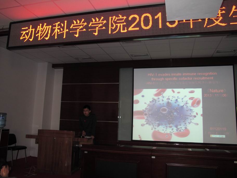 2013年12月27日下午,公司举行了颁奖仪式,并由获奖员工进行了专题汇报报告。经理张嘉保教授,副经理欧阳红生教授,动物生物技术系主任逄大欣教授等领导和老师参加了汇报报告及颁奖会,并为获得一、二、三等奖的史刘歆、吴至竞等12名员工颁发了获奖证书。