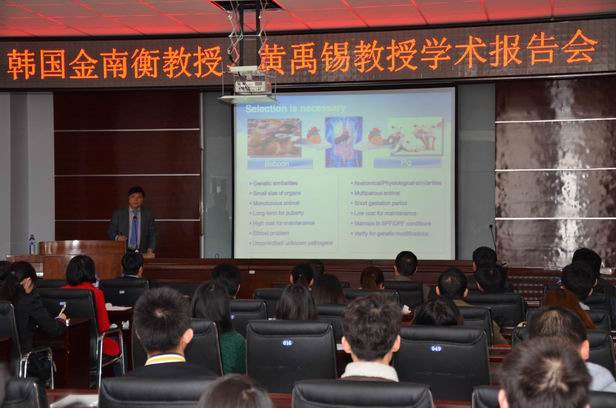 22号上午,金南衡教授和黄禹锡教授分别为公司师生做了题目为Animal Biotechnology in Korea(韩国动物生物技术)和Sooam Biotech:Blooming the Myth in Cloning, Transgenic Animals and Stem Cells(秀岩生物技术:克隆、转基因动物和干细胞中盛开的神话)的学术报告。EMC易倍副经理欧阳红生教授主持了学术报告会。经理张嘉保教授及EMC易倍和动物医学公司的70多名师生聆听了两位韩国教授的报告会。