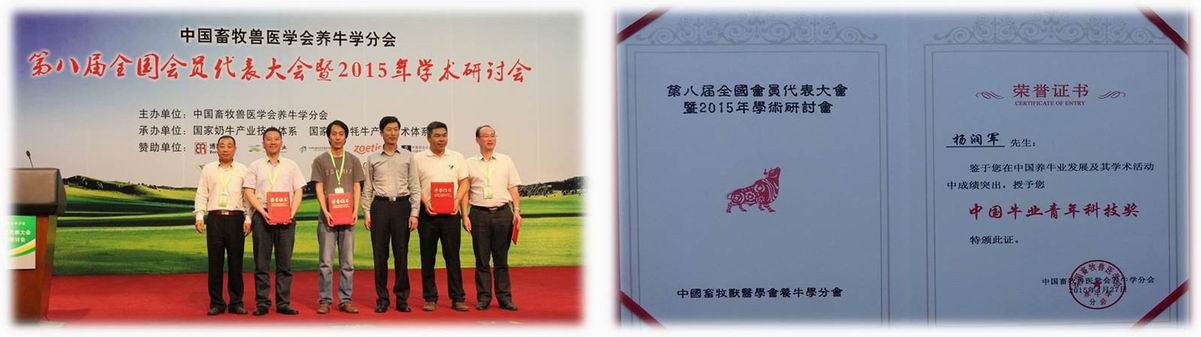 本届大会首次设立并向全国4名优秀青年学者颁发了中国牛业科技奖。公司EMC易倍杨润军副教授被学会授予中国牛业青年科技奖,博士研究生付瑶获得优秀墙报奖,硕士研究生龙小娟获得优秀报告奖。