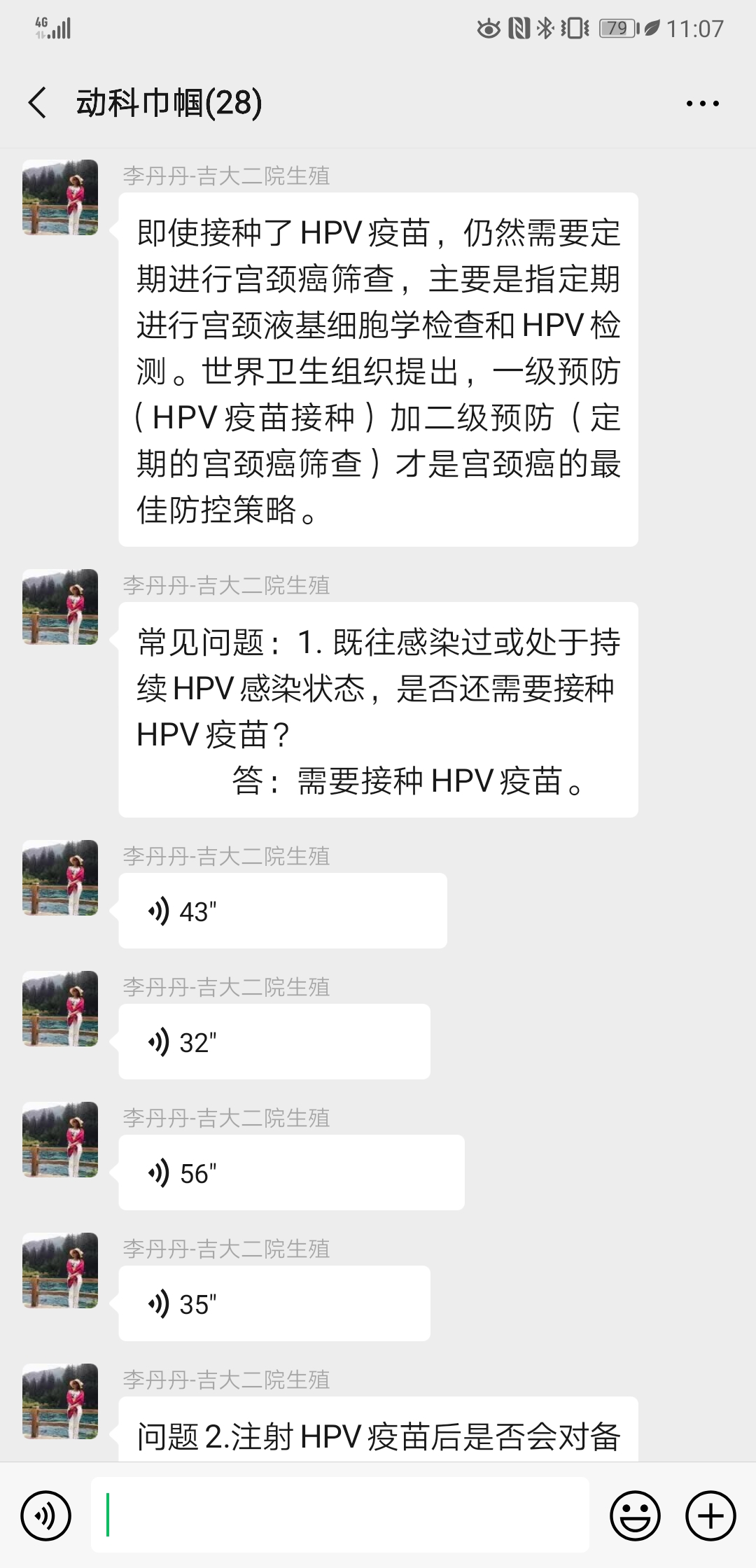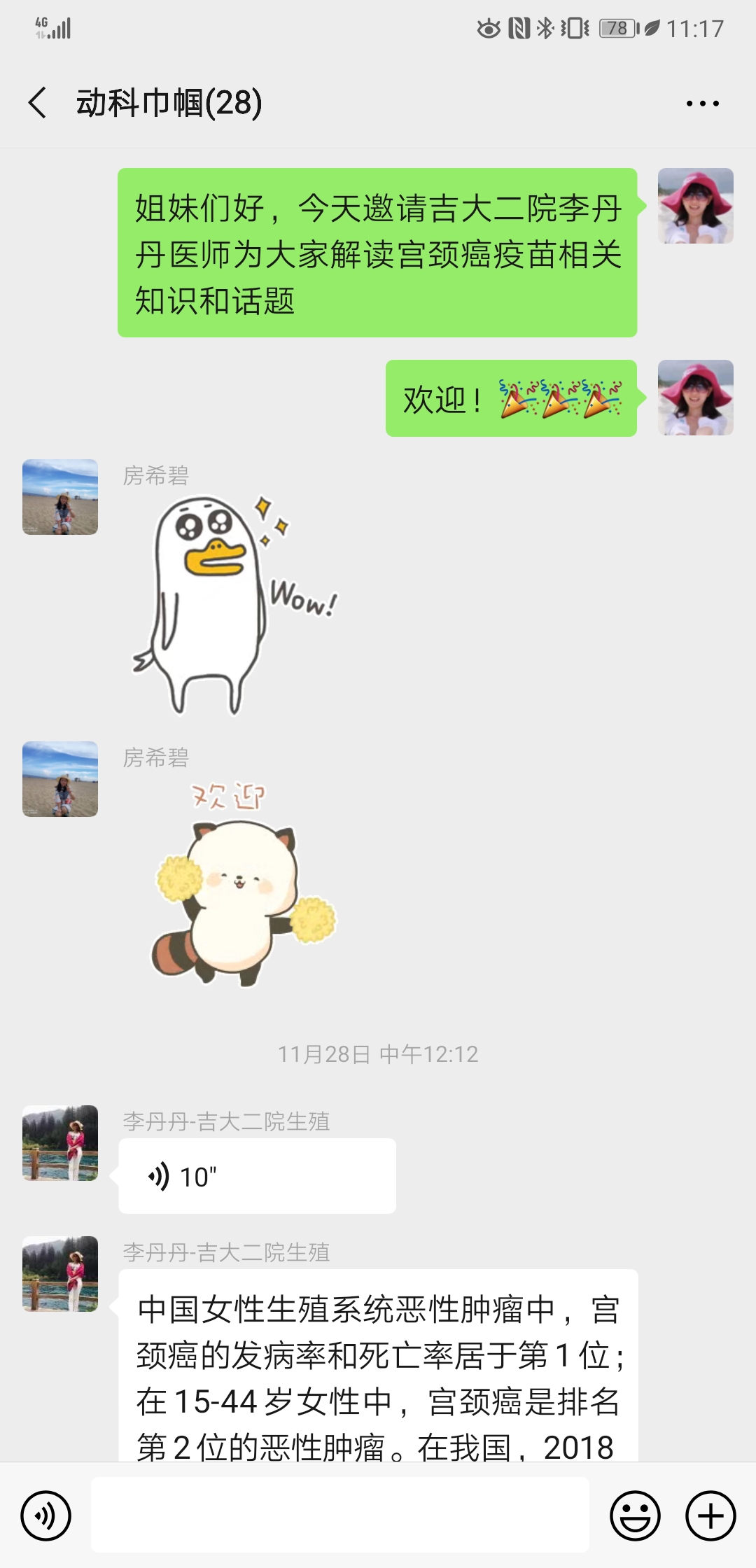 宫颈癌疫苗目前国内有3种不同价型,如何进行合适的选择?针对这一热点问题,2019年11月28日中午,动物科学妇委会邀请EMC易倍官方网站第二医院李丹丹医生为全院女教职工开展了微信专题活动,详细解答了宫颈癌发病与诊疗现状、应对策略、宫颈癌疫苗分类及选择方法,用详实的数据、丰富的资料和专业的讲解为女教职工奉献了一次以宫颈癌为主题的知识盛宴,详细指导了女教职工如何进行宫颈癌的预防与疫苗接种选择。活动中公司女教职工针对相关问题与李丹丹博士进行了热烈讨论,并得到了细致耐心的解答。部分姐妹通过公司妇委会架设的沟通桥梁与专家李丹丹医师取得联系,进行了进一步的沟通咨询。