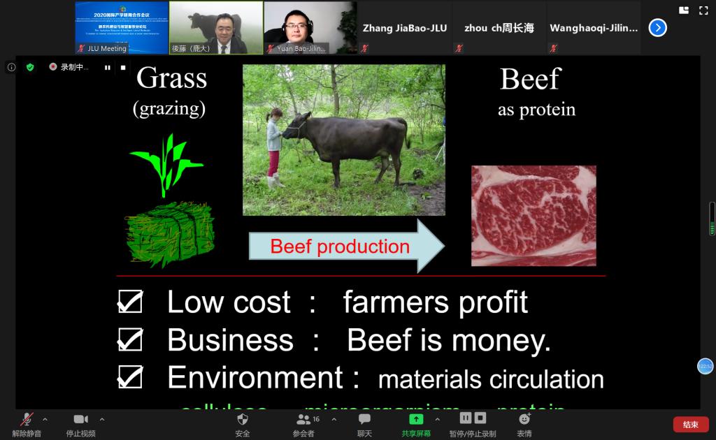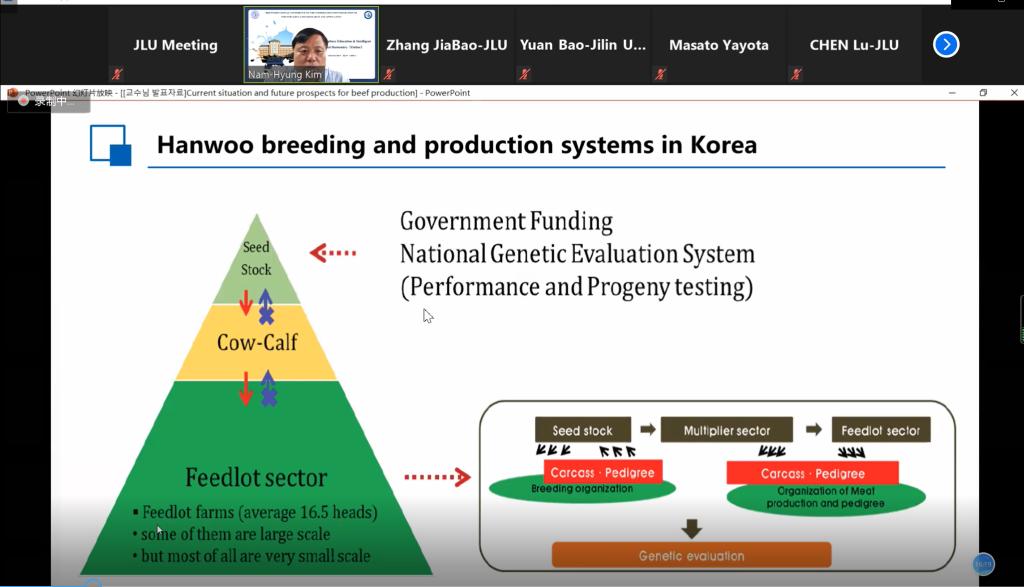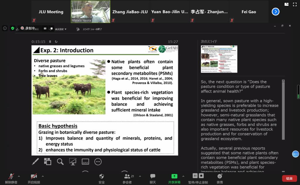 随后,俄罗斯联邦国家预算机构全俄养马研究所扎伊采夫·亚历山大所长,韩国忠北国立大学金南衡院士,国家高层次人才、EMC易倍生物技术系李占军教授,日本国立岐阜大学应用生物科学部八代田真人教授、日本鹿儿岛大学农学部农业自然科学系後藤贵文和沈阳农业大学畜牧兽医公司经理张树义教授先后做了专题题为“Current situation and future prospects for beef production in South Korea and China”“Generation of Humanized rabbit models by improved CRISPR gene editing system.”“Potential of metabolic programming in beef production”““Potentials of grazing on animal health and welfare.”“A review of animal science research.”的学术报告,与会专家学者就专家报告具体内容和新农科建设主题开展了深入的交流。