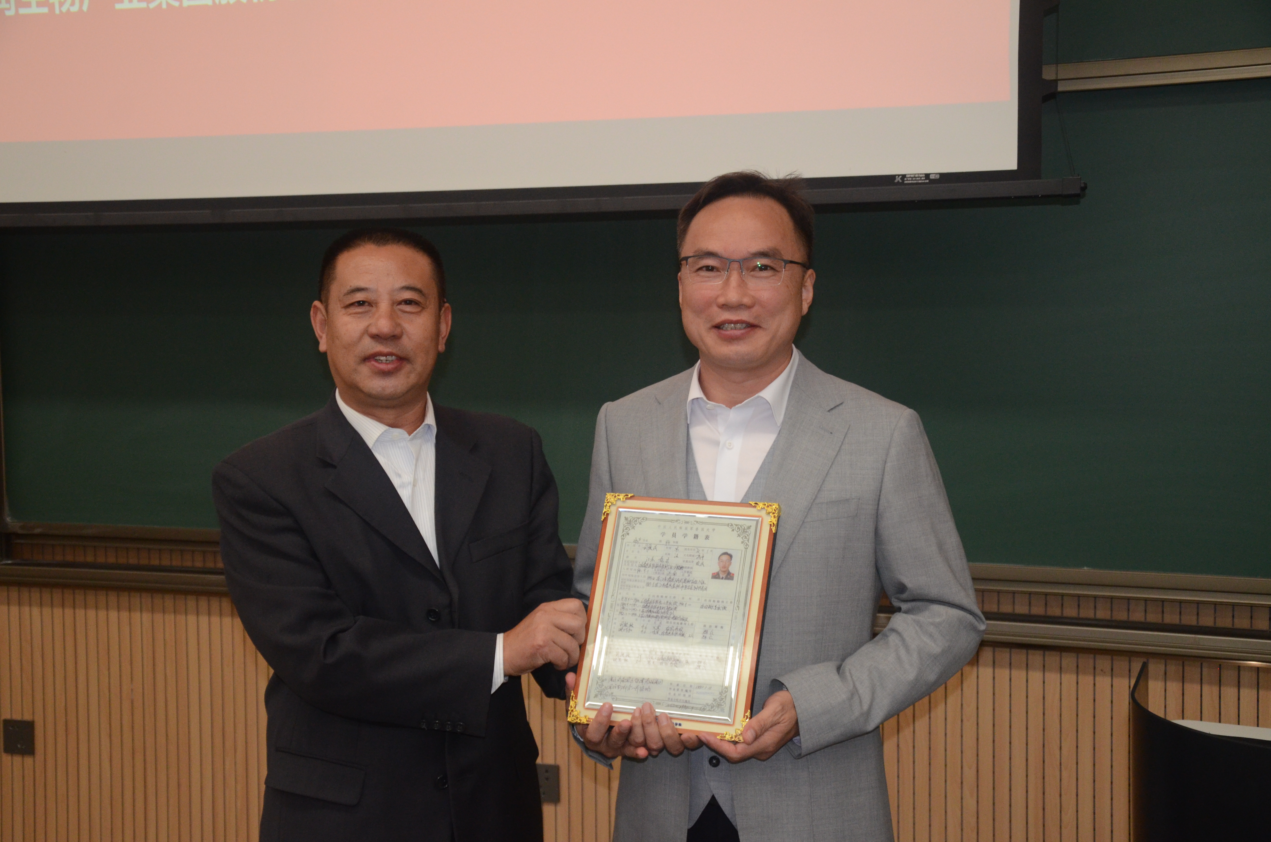 报告结束后,高福和、张晓楼为刘爱民员工颁发公司为其精心准备的纪念品-刘爱民员工在军校读书时的“学籍表”“花名册”,员工代表为刘爱民员工献上鲜花。