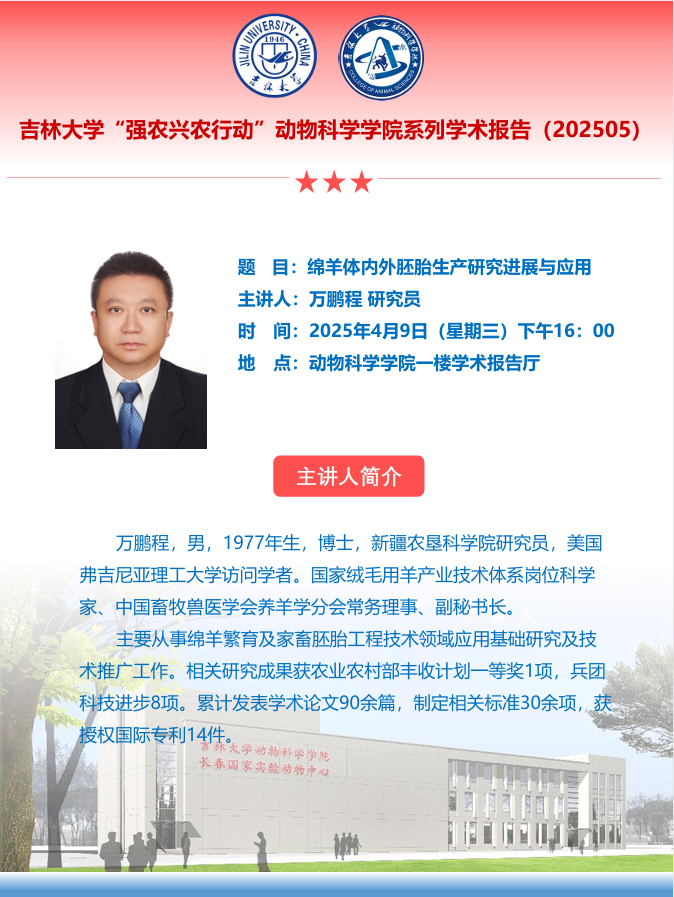 万鹏程,男,1977年生,博士,新疆农垦科公司研究员,美国弗吉尼亚理工大学访问学者。国家绒毛用羊产业技术体系岗位科学家、中国畜牧兽医学会养羊学分会常务理事、副秘书长。